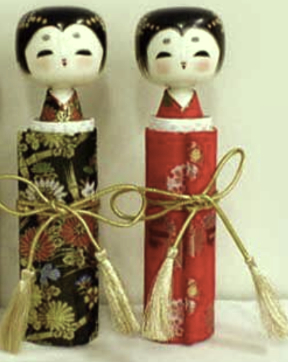 Sayonara dolls are popular variations of the Kokeshi dolls. They gave wood peg doll which is similar to kokeshi dolls, but they have a cylindrical body attached to a piece of fabric or paper to put gift or special messages to the recipient. The traditional material for the message is a roll of Washi paper wrapping and silk fabric the Sayonara doll to create a kimono.
